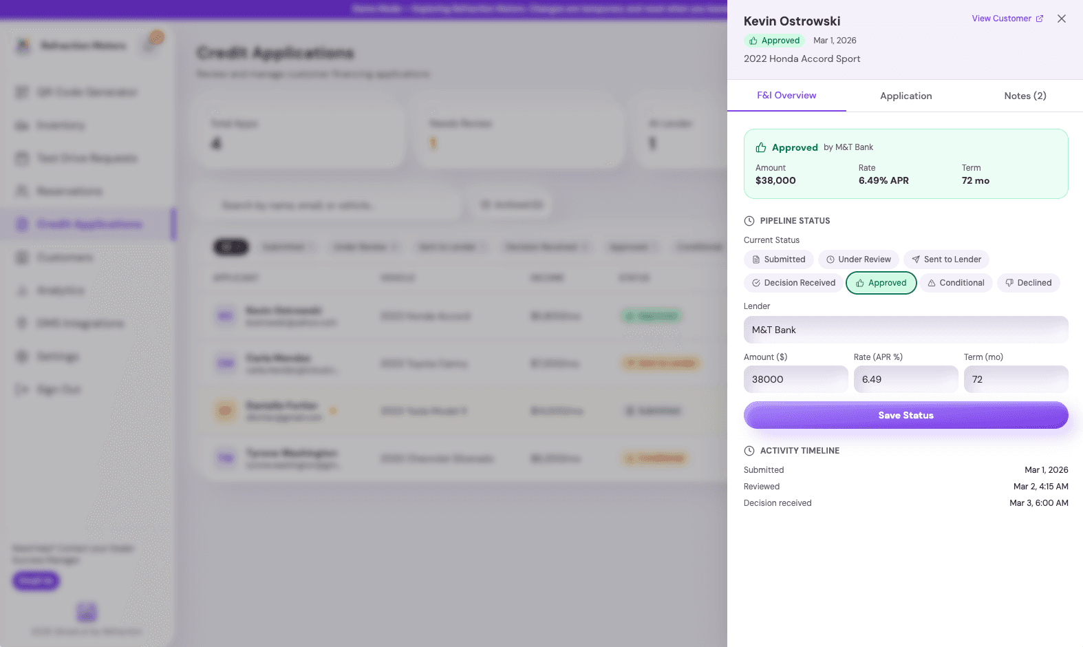 Accept credit applications online and manage your F&I pipeline from submission through lender decision. Track statuses, assign lenders, and keep your finance team organized in one place.