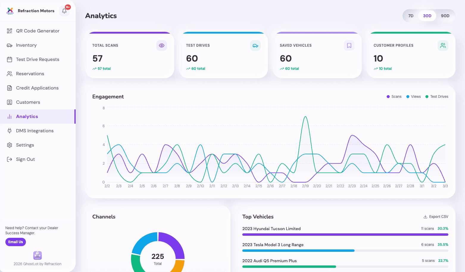 See which vehicles get the most attention, which channels convert, and where your leads come from. Real numbers, not guesses.